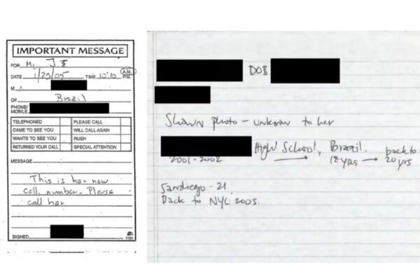 Em outro documento da investigação, há uma anotação manuscrita indicando que uma mulher teria sido fotografada sem saber da existência da imagem. O nome da pessoa foi ocultado, mas o texto informa que ela teria ido ao Brasil aos 18 anos e retornado aos Estados Unidos dois anos depois.