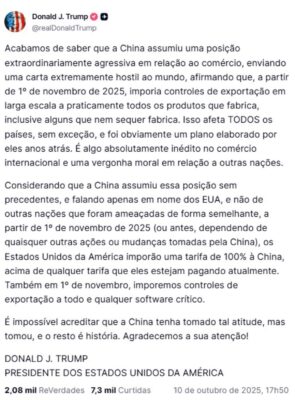 A China reagiu à promessa do presidente dos Estados Unidos, Donald Trump, de impor uma tarifa adicional de 100% sobre todos os produtos importados do país, em resposta ao que chamou de “posição extraordinariamente agressiva” adotada por Pequim no comércio internacional. Pequim fez os primeiros comentários sobre as afirmações de Trump e ressaltou a imposição de contramedidas, caso a tarifa seja concretizada. Porta-voz do Ministério do Comércio afirmou, neste domingo (12/10), que “se os EUA persistirem em agir unilateralmente, a China tomará de forma resoluta as medidas correspondentes para salvaguardar…