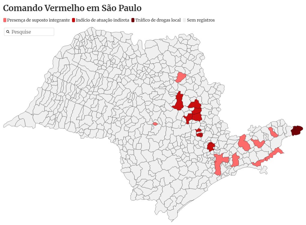 Ao menos 23 cidades do estado de São Paulo teriam registrado a presença do Comando Vermelho (CV) nos últimos três anos, conforme levantamento feito pelo Metrópoles em processos judiciais e boletins de ocorrência registrados desde janeiro de 2023. Os documentos indicam a influência da facção carioca em diferentes níveis, seja por meio da presença de integrantes, da atuação indireta ou até do domínio do tráfico de drogas na região.