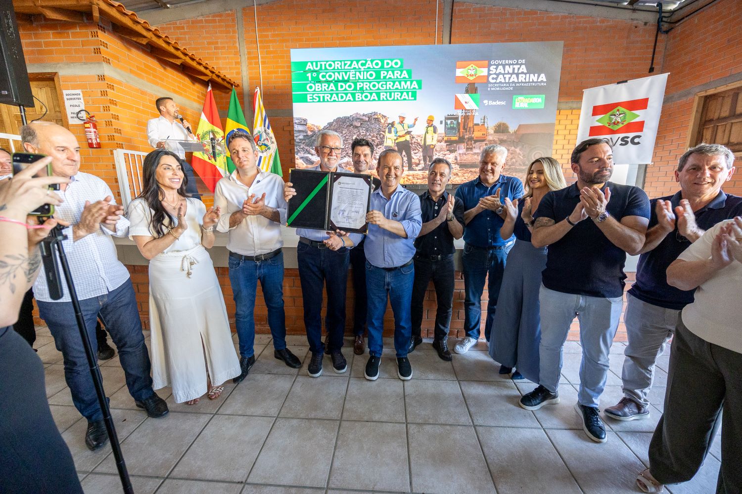 O primeiro convênio do programa Estrada Boa Rural com uma prefeitura foi assinado neste sábado, 15, pelo governador Jorginho Mello, em Cocal do Sul. A iniciativa que visa levar asfalto para vias rurais foi lançado em julho. Na cidade do Sul do estado serão nove quilômetros com investimento de R$ 12 milhões.