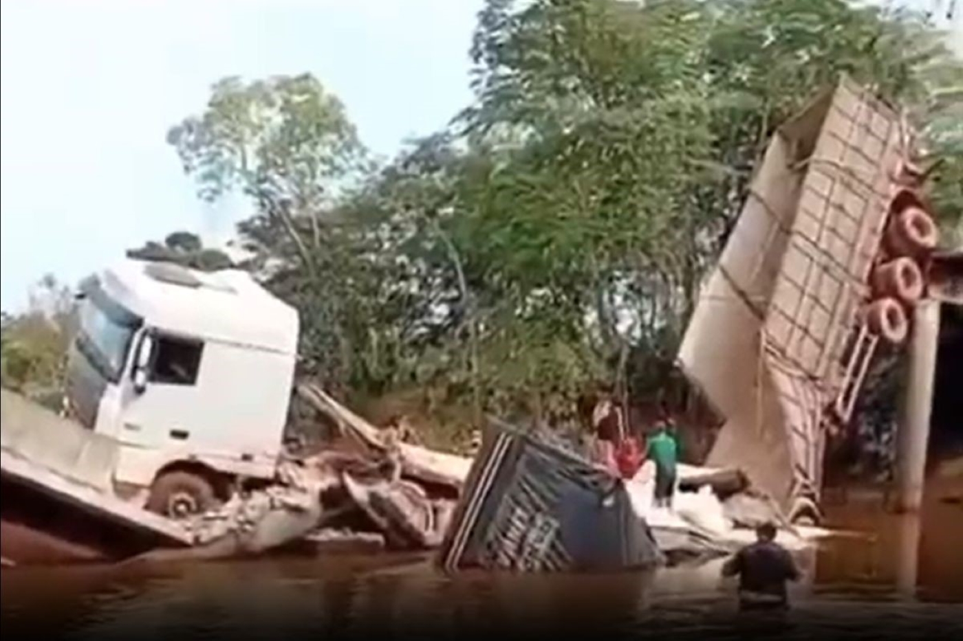 O caminhão transportava grãos de milho quando a estrutura cedeu. Com o colapso da ponte, o veículo ficou parcialmente submerso no rio. A carga se espalhou pela água, enquanto a cabine permaneceu fora do nível do rio.